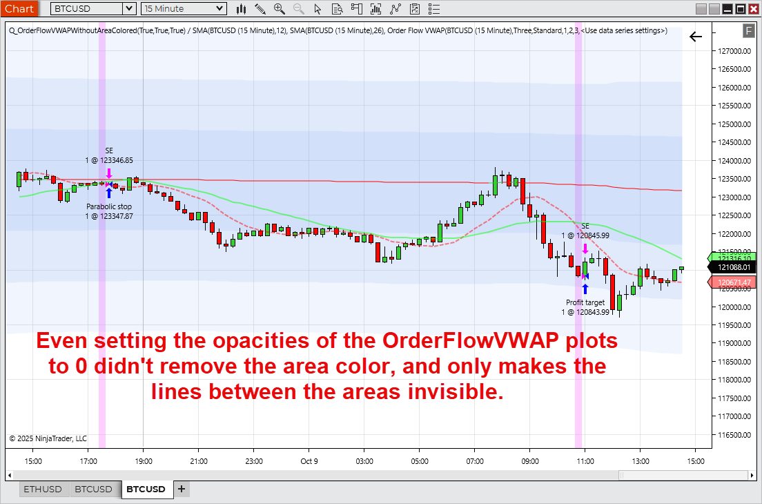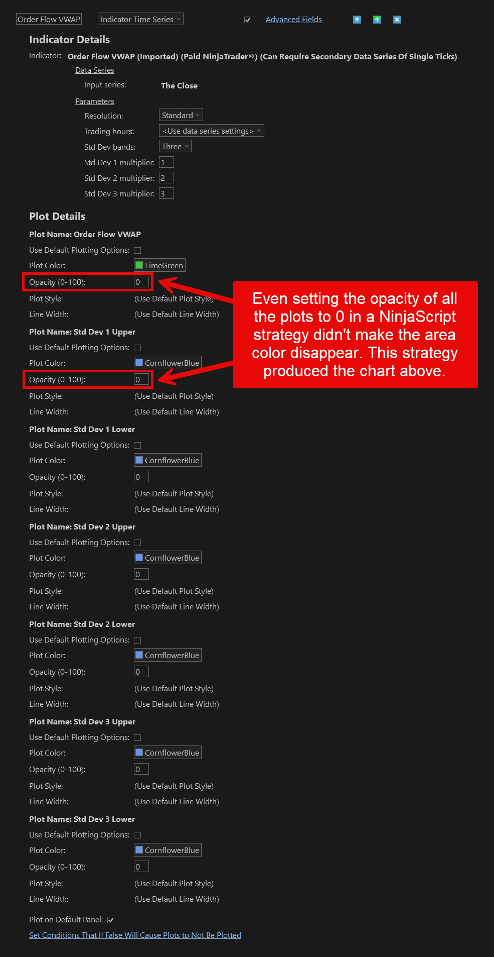 I think you’re right @Luisma_Delgado. The factory methods available to a NinjaScript strategy that allow an OrderFlowVWAP indicator to be instantiated and used algorithmically don’t have parameters for the area opacities like can be set when adding the OrderFlowVWAP indicator to a chart manually. I even created a NinjaScript strategy without code using Quagensia that set all the plots of OrderFlowVWAP to have opacities of 0 and even this didn’t not remove the colored areas.