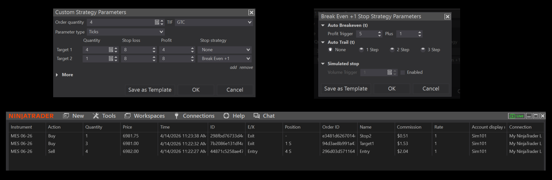 As seen in the ATM strategy, I’m using 4 contracts. 3 taken at the first target, 1 left for the second target. The Break Even shows moving the stop to break even + 1 after a 5 tick profit. I chose 5 so the price has to move through 5 ticks before moving the stop.