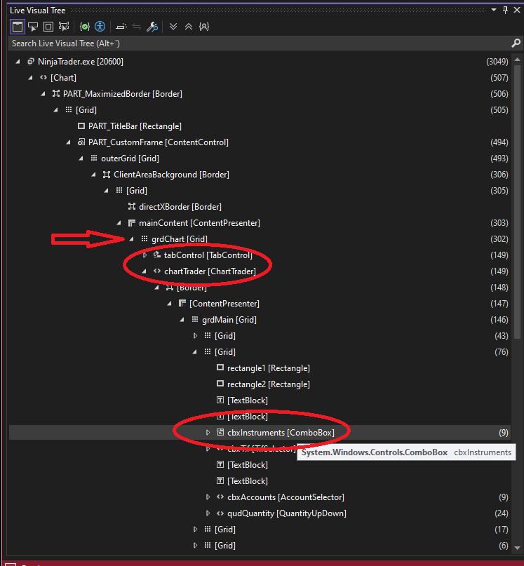 myInstrumentSelector = Window.GetWindow(ChartControl.Parent).FindFirst("ChartTraderControlInstrumentSelector") as System.Windows.Controls.ComboBox;