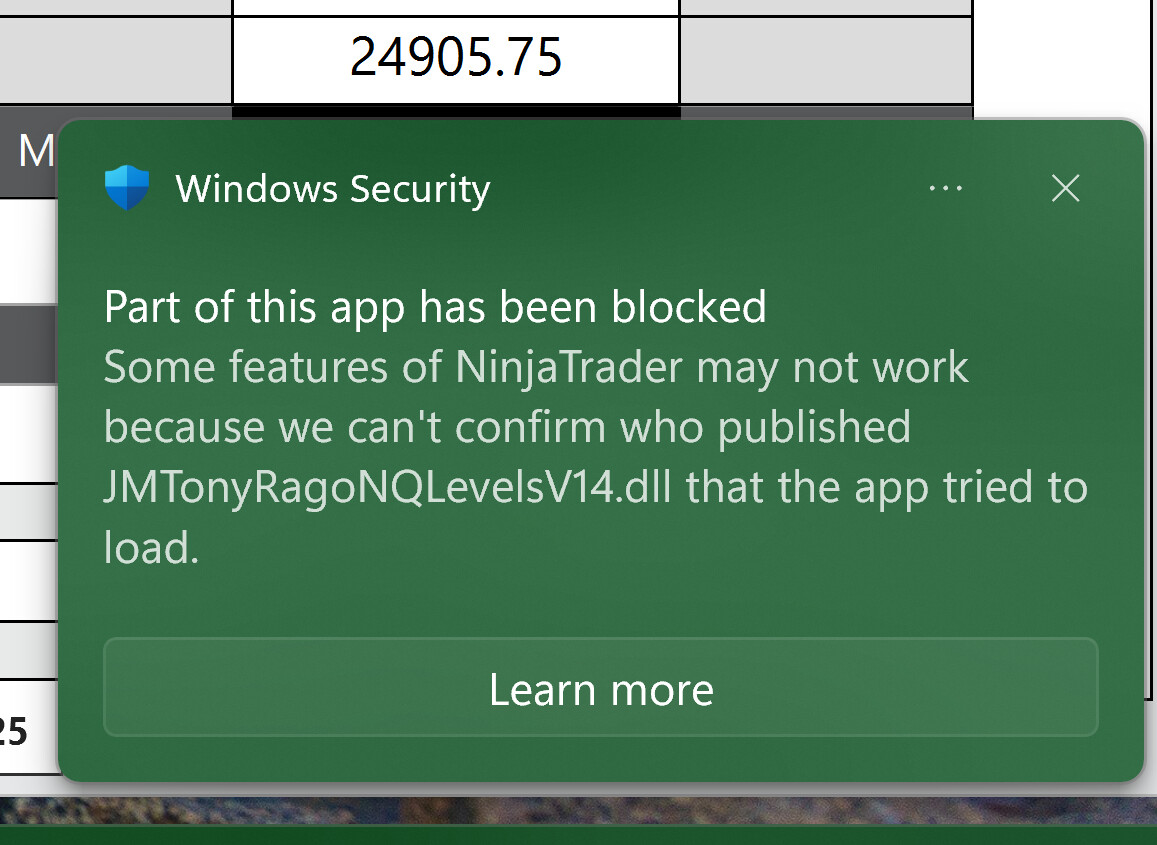 hi, I have a DLL file that is an indicator (a ninjascript add on) I used that is being blocked by Windows 11 because of the Smart App Control security software. How can I fix this? The DLL file is fine and not corrupt.
