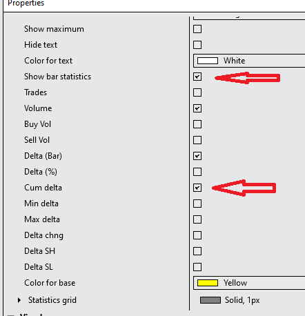 You were almost there in your properties screenshot. Keep scrolling down in the data series properties until you find the “Show bar statistics” option. Enable it to see the text data on the bottom of the chart. Then just select which stats you want to track.