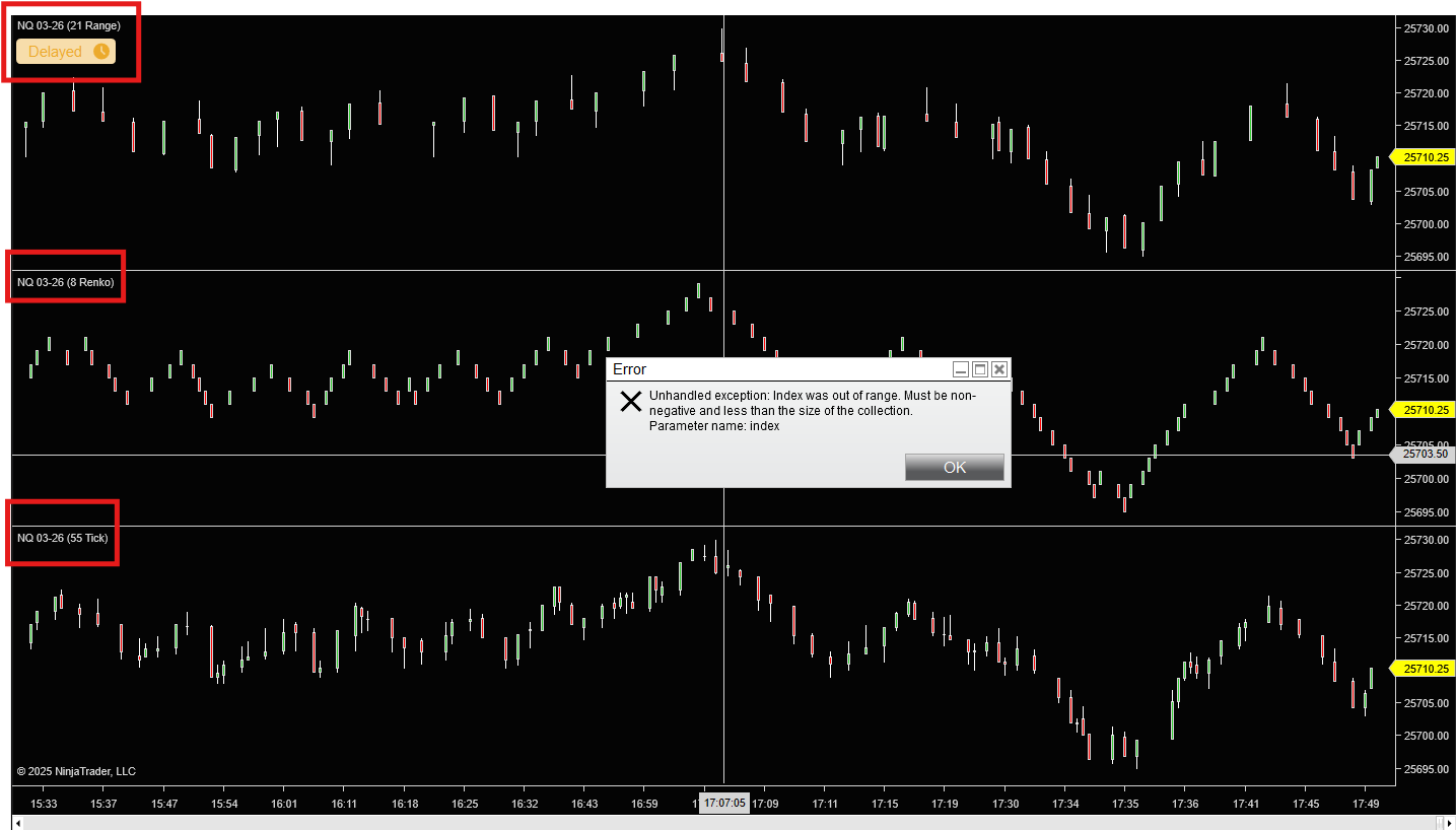 I’m simply adding a range, renko and tick to a chart without any indicators and using “Live” connection as data source for simulating trading, then it errors out.