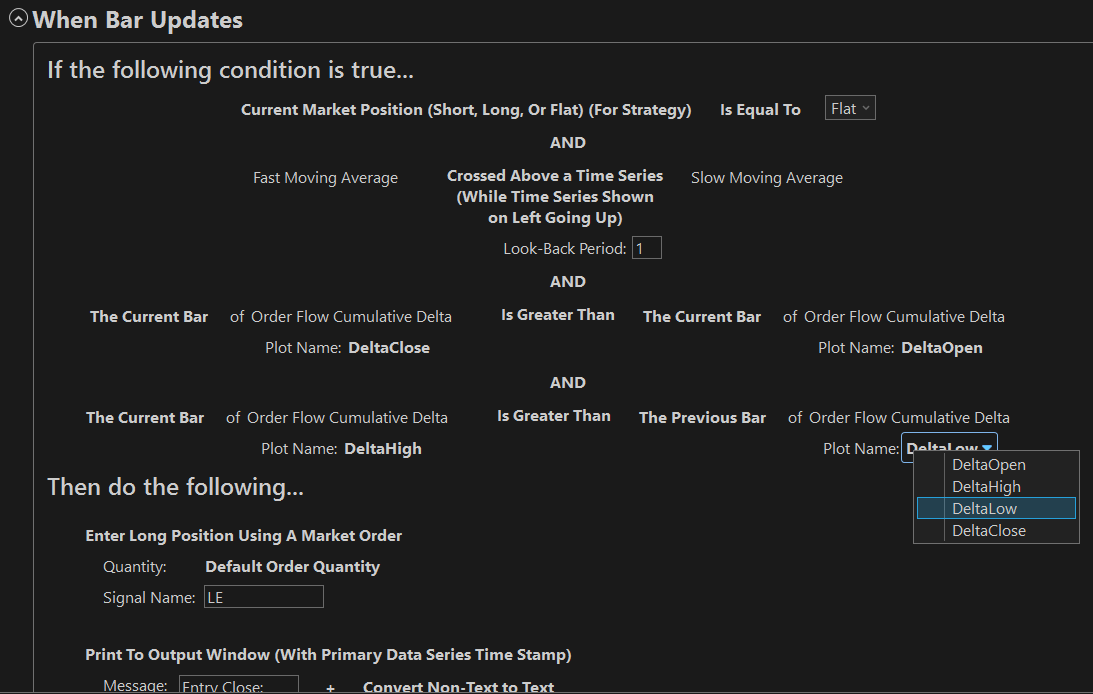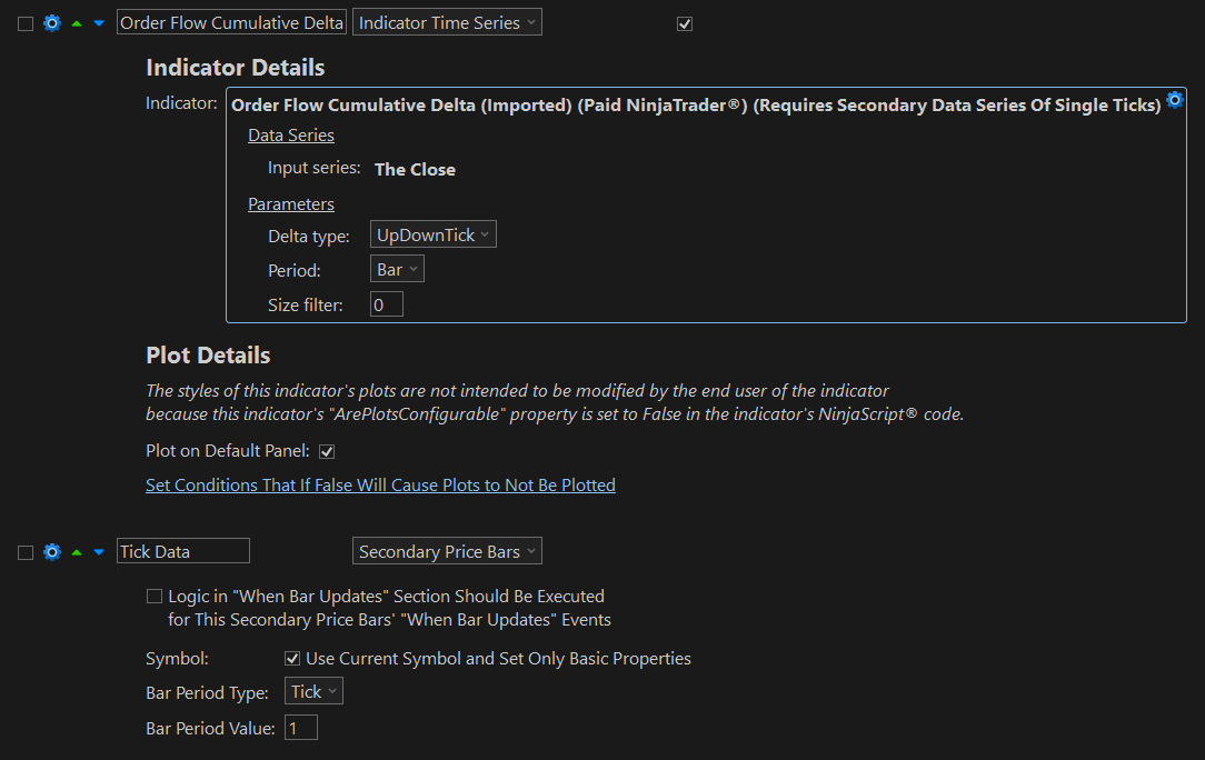 This indicator requires a secondary data series of single ticks to be added to the NinjaScript strategy to function properly as well. Here is an example of setting up the Order Flow+ Cumulative Delta indicator and a secondary series of ticks in a no-code strategy for NinjaTrader built with the no-code strategy builder for NinjaTrader from Quagensia.