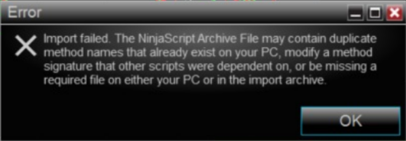 I am trying to import an add-on that I downloaded from ninjatrader.com; however, when I attempt to import the file, the error shown in the image below appears. I downloaded another add-on, and the same thing happened. I am using Ninja 8. This is the first time I have added a script to my Ninja platform.