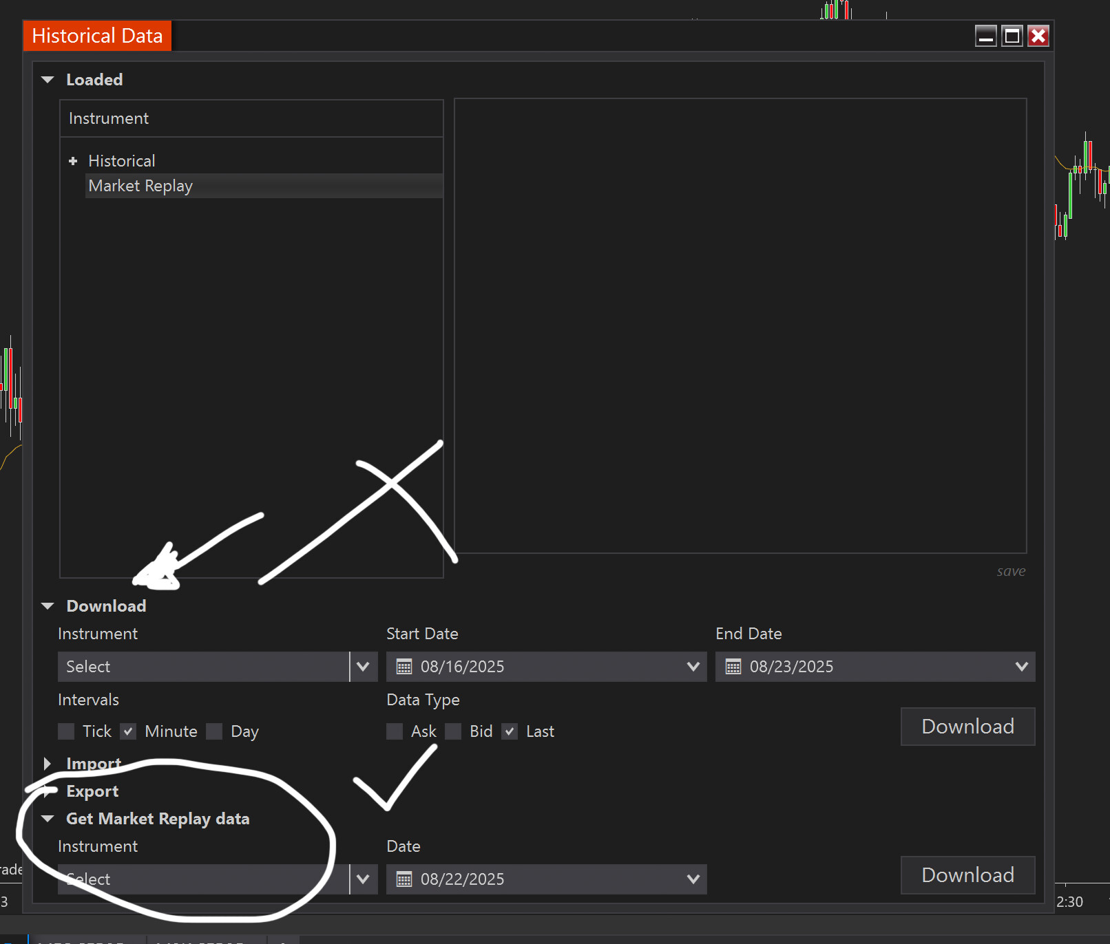Thank you for the answer! My problem is the following: with my data feed connected I go to Tools â Historical Data. There I download for instance the period from January 13, 2025 up to January 31, 2025 for ES. Once the download is finished then I switch off the connection to the data fee. At this stage I turn on the playback, I select as Start date 14/01/2025 and I open the ES chart on 1 minute time frame. In the chart I see the candles. Then I push the play button: HERE nothing moves in the chart while time actually is flowing in the Playback window. In fact only upon Reload all historical data I can see the new candles that have printed. However itâs impossible to me to see a kind of replay of the market, so seeing candles that are forming. Am I doing something wrong? Thank you!!