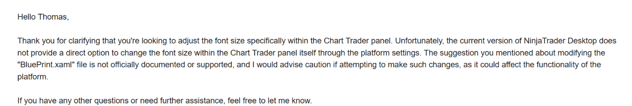 There have been multiple requests over the years (for over 15 years now) to increase the font size of chart trader. Nothing happened yet. Ninja Trader doesn’t seem to care about their customers …