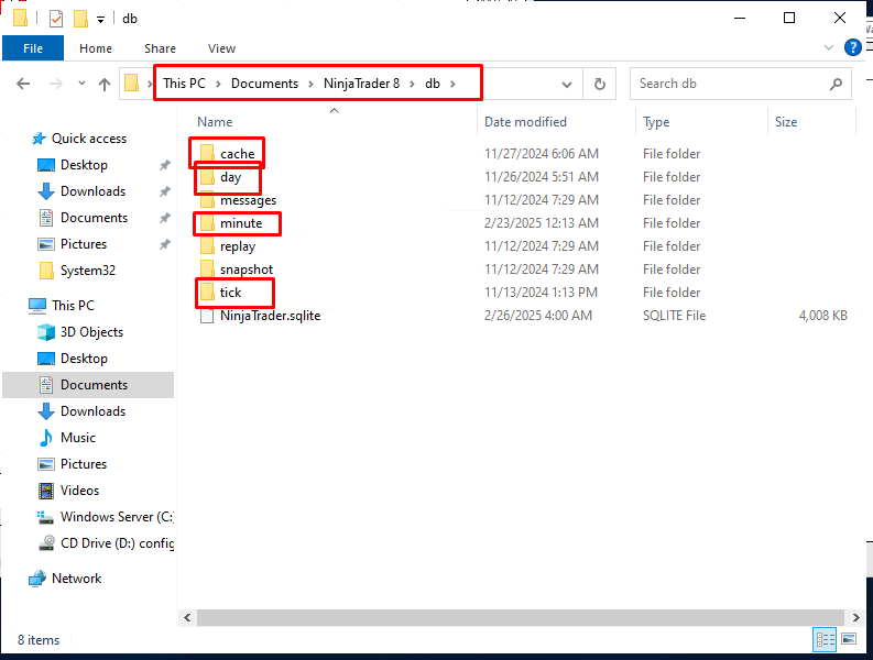 - Navigate to the Documents/NinjaTrader 8/db folder.