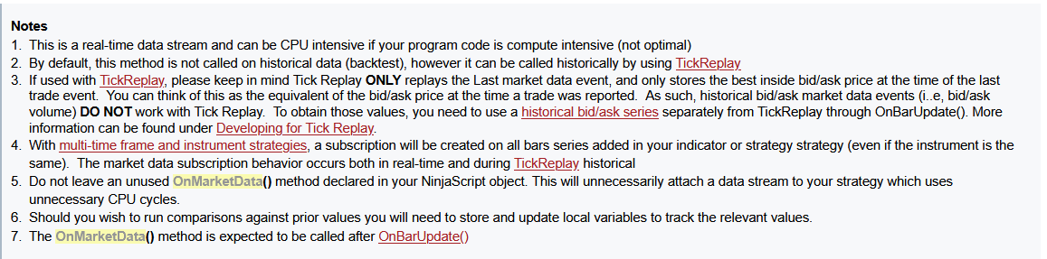 AudiblePriceAction (similar to tick strike or bookmap’s market pulse) and Spread (shows the latest price spread). It’s also been useful for non-bid/ask events like capturing the settlement price. In general though I try to avoid it given the computational overhead and historical data limitations. Not to mention with a 1-Tick historical series, or realtime with calculate set to “on each tick”, OnBarUpdate is called before OnMarketData allowing a slightly faster reaction to the event in either state.