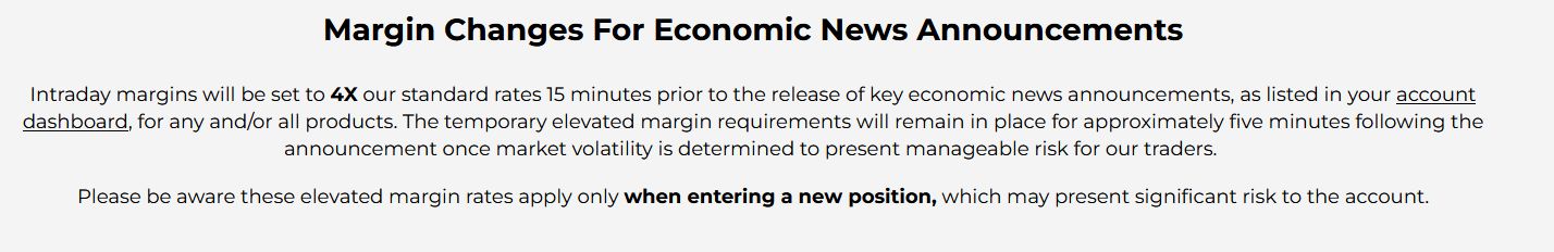 So I read on their website: "Intraday margins will be set to 4X our standard rates 15 minutes prior to the release of key economic news announcements, as listed in your account dashboard(Opens in a new window), for any and/or all products.