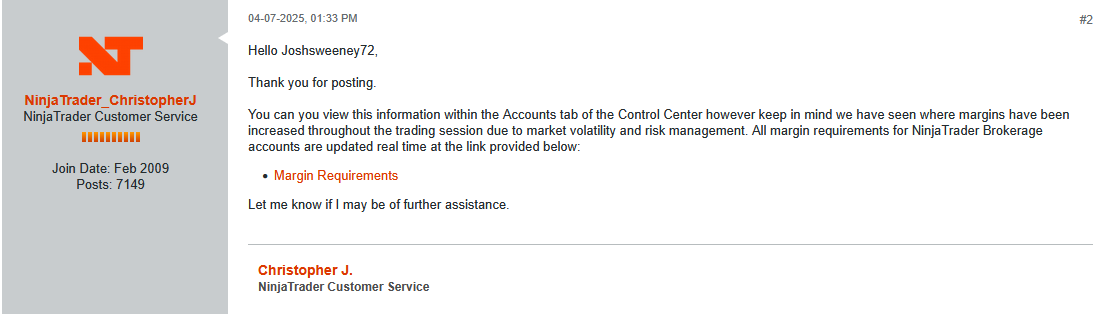 Appreciate that Marcus. My issue is that the Excess Intraday Margin shows my whole account value - which doesn’t tie in with the information on your screenshots PLUS i got a warning on my phone about potential margin issues ( even though to my knowledge I had 3 times the room required for the position). Hence i have gone beyond the bots and hope to get a human response from NT. If i dont’ i will remove my account with them because i can’t have this threat hanging over me every time i enter a position that they could liquidate due to some made up margin change in the middle of the day. I accept news events multiply margin by 4X 15 minutes before - that’s fine because I know about it but you can’t just randomly change margins whilst you’re in a position and then potentially liquidate that without informing me IN REAL TIME. because then I can do something about it.