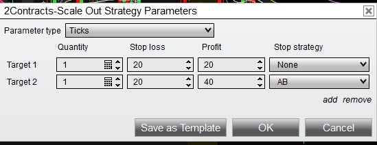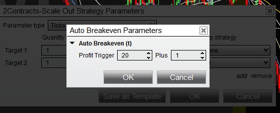I am trying to set up an order/trade template. 2 contracts. Both have the same stop loss. One closes at 20 ticks. the second one closes at 40 ticks. Once 20+1 ticks are achieved, I want the second stop pulled to breakeven. The way I have it set up now, it cancels my second contract immediately upon placing it.