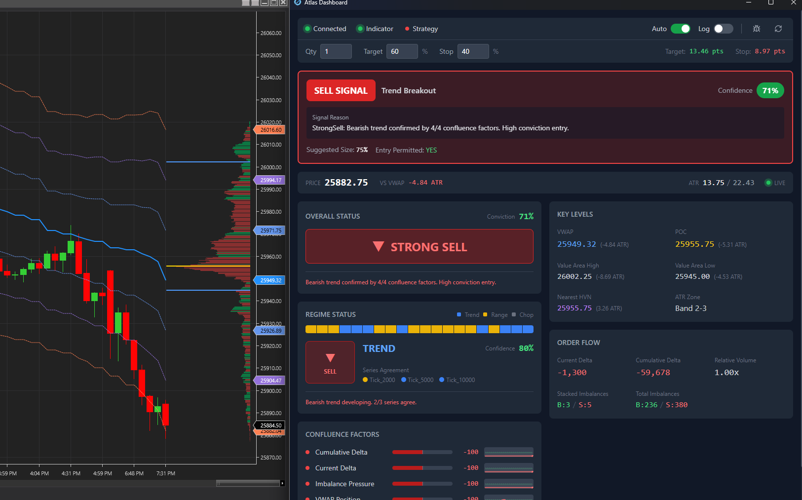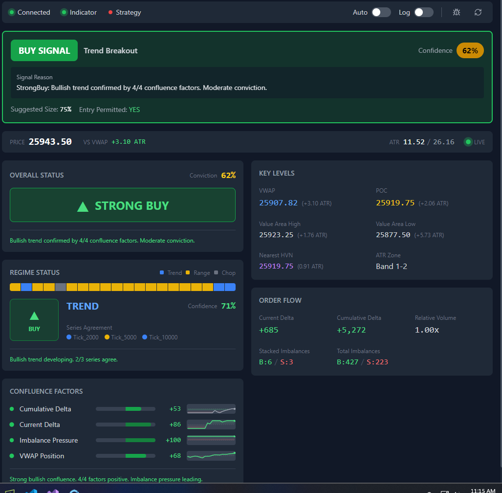 Example. NT on left just powers my dashboard on the right. With Auto toggled on and if I have my strategy running, I can just have it auto trade and have the strategy execute the trades. I can do whatever I want with the dashboard. For example, I was thinking of playing around with sending the data to a ChatGPT or Gemini to see what it analyzes.