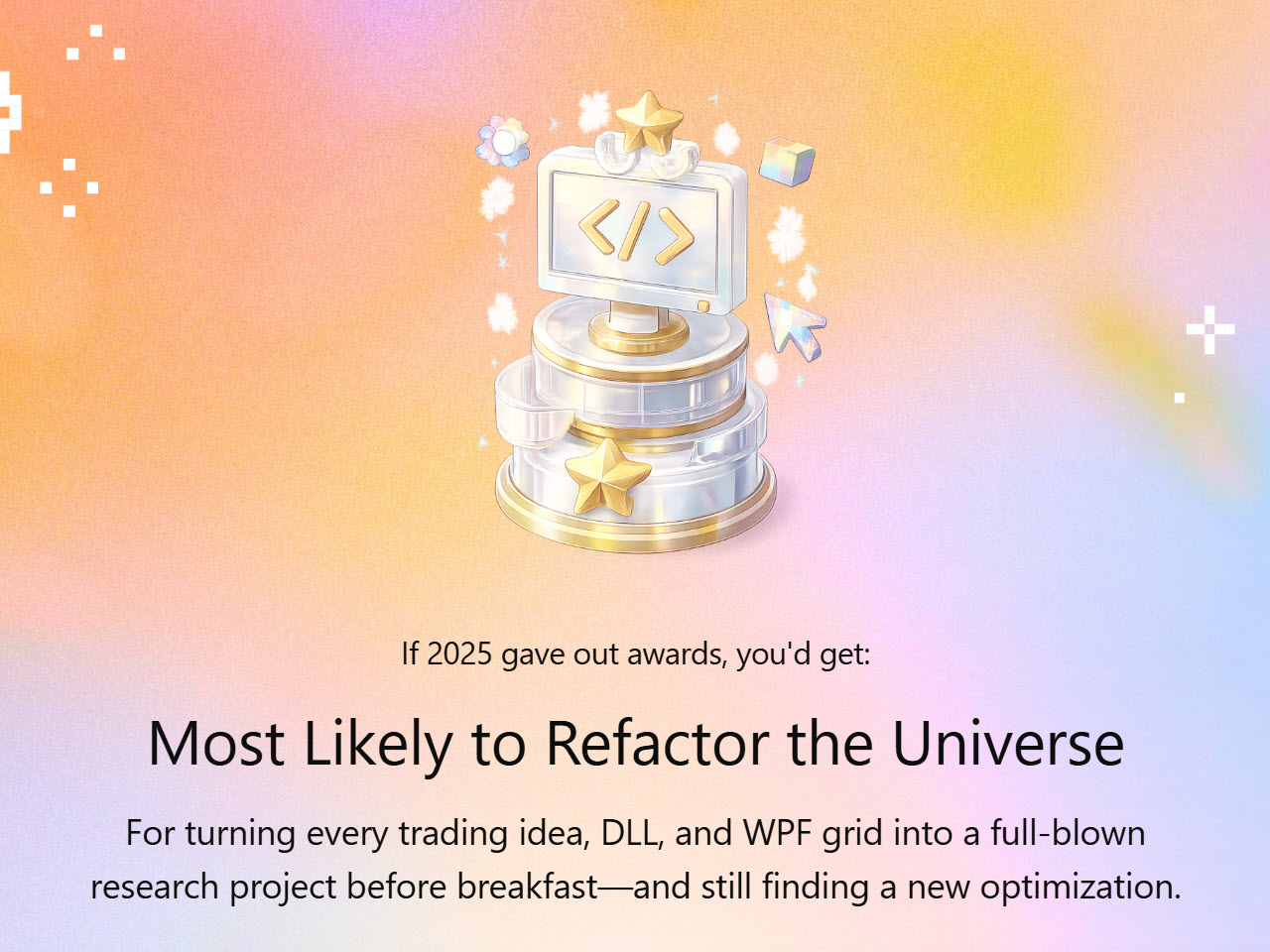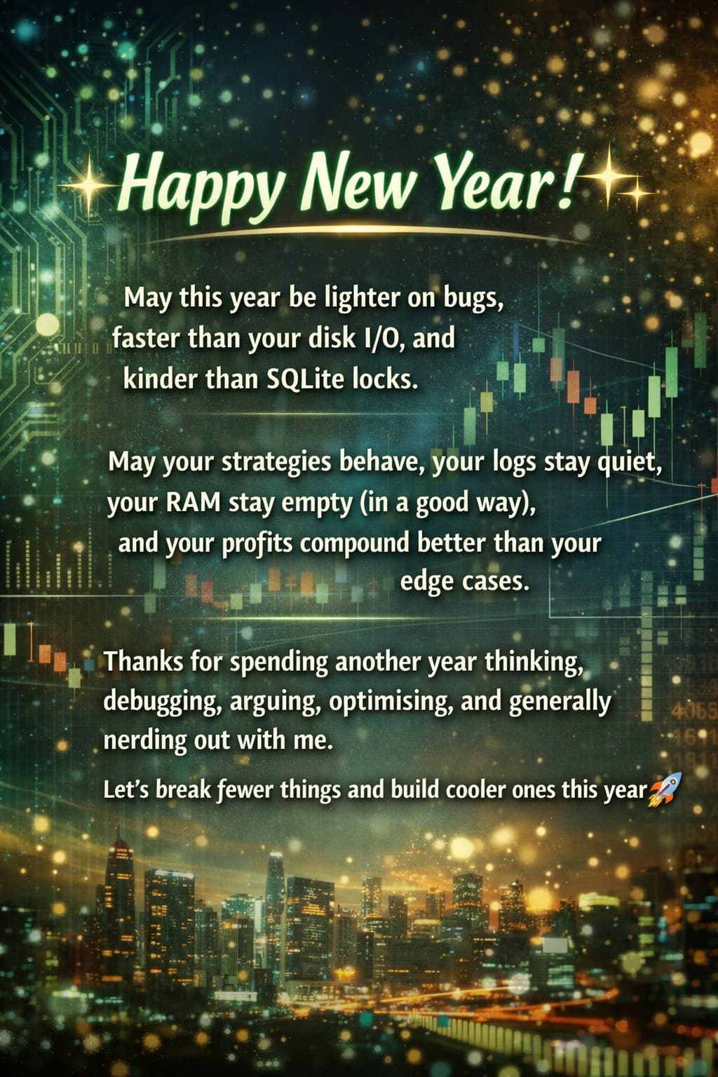 I had to ask chatgpt to make me a new year card, how did you guys get it by default…but i would say co-pilot is much better at coding ninjascript and basically everything from powershell scripts to python scripts…even co-pilot gets the APIs wrong sometimes (contrary to chat gpt who just makes up whatever random API he can think of when there is absolutely nothing like that in reality in ninatrader), basically a task that would require 10 iterations with chat gpt will happen in just a couple of iterations with co-pilot and co-pilot understands the hardware of the vps and the architecture of ninjatrader too well.